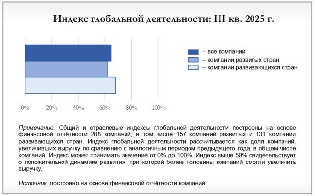 Индекс глобальной деятельности. Деятельность крупнейших компаний мира в III кв. 2025 г. сохранила положительную динамику — Индекс глобальной деятельности (ИГД) составил 65%, означая, что почти 2/3 компаний увеличили выручку по отношению к аналогичному периоду предыдущего года. Значение индекса оказалось на 2 п.п. выше показателя второго квартала года. Наиболее высокий положительный прирост ИГД наблюдался в нефтегазовом секторе, где, несмотря на продолжающуюся волатильность цен и рост операционных издержек, почти треть производителей увеличили выручку, и в сталелитейной отрасли, в которой происходило постепенное восстановление отраслевой конъюнктуры после слабого второго квартала года. Максимальное падение продемонстрировал транспортно-логистический сектор, прежде всего в результате продолжающегося ценового давления на морских перевозчиков.